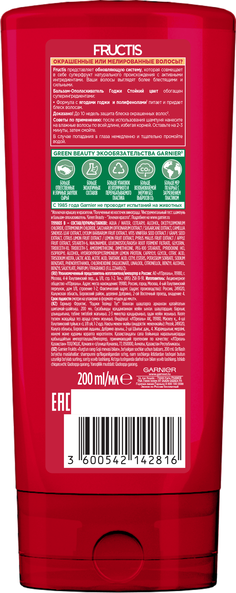 Fructis представляет обновляющую систему, которая совмещает в себе суперфрукт натурального происхождения с активными ингредиентами. Ваши волосы выглядят более блестящими и сильными. Бальзам-Ополаскиватель Годжи Стойкий цвет обогащен суперингредиентами: Формула с ягодами годжи и полифенолами питает и придает блеск волосам. Доказано! До 10 недель защита блеска окрашенных волос.