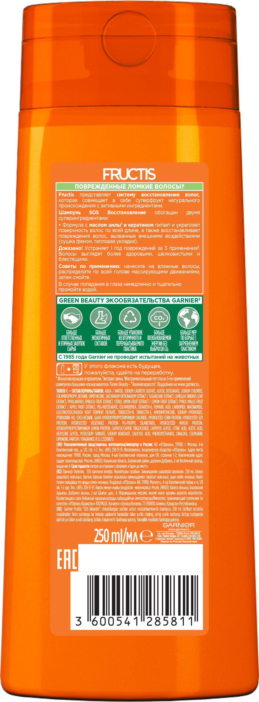 Fructis представляет систему восстановления волос, которая совмещает в себе суперфрукт натурального происхождения с активными ингредиентами. Шампунь SOS Восстановление обогащен двумя суперингредиентами: Формула с маслом амлы и кератином питает и укрепляет поверхность волос по всей длине, а также восстанавливает повреждения волос, вызванные внешними воздействиями (сушка феном, тепловая укладка).